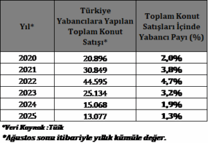 2025 yılı Ağustos ayında ilk sırayı 671 adet konut satışı ile İstanbul aldı. İstanbul’u sırasıyla 576 adet konut satışı ile Antalya ve 123 konut satışı ile Mersin izledi.