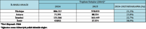 İstanbul, İzmir ve Ankara özelinde bakacak olursak; 2025 yılı Ağustos ayı sonu itibariyle kümüle konut satışlarının, 2024 yılı aynı dönemine nazaran İstanbul’da yaklaşık %22,7, Ankara’da %23,8 ve İzmir’de ise %30,9 oranında arttığı görülmektedir.